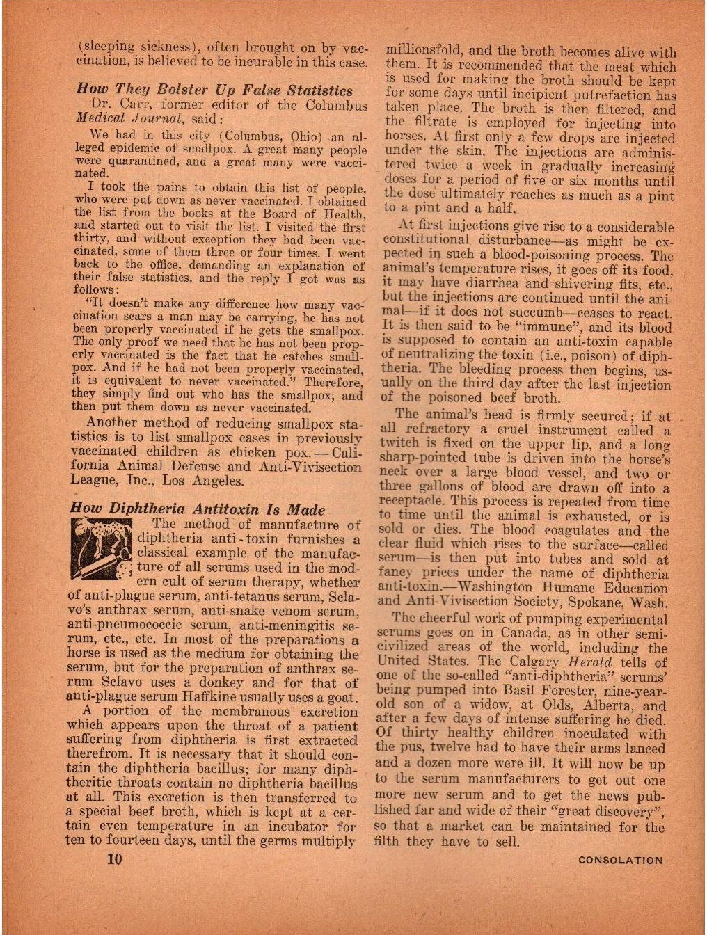 El trabajo alegre del bombeo del suero experimental sigue en Canadá, así como en otras zonas semicivilizadas del mundo, incluyendo los EE.UU. El periódico de Calgary Herald, habla de cómo uno de los llamados sueros "antidifteria" es bombeado en Basil Forester, un niño de nueve años hijo de una viuda, en la localidad d Ods, Alberta, y cómo después de unos días de intenso sufrimiento, muere. De treinta niños inoculados con el pus, a doce se les hincharon sus brazos como una bota y otra docena enfermaron. Ahora corresponderá a los fabricantes de suero inventarse uno nuevo más para poder salir en las noticias, publicándolo por todas partes, su "nuevo descubrimiento", para que se pueda mantener un mercado para vender sus asquerosos productos.